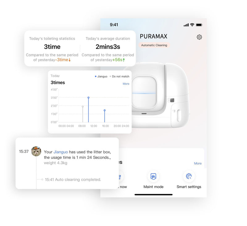Echtzeitverfolgung der Toilettengewohnheiten Ihres Haustieres sowie Analyse historischer Daten zur Vermeidung von Harnwegserkrankungen auf der Grundlage von Daten zu Toilettengang, Zeiten und Dauer.