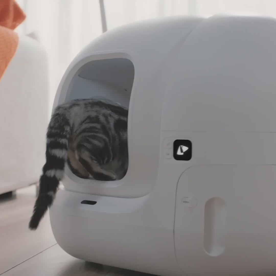 Platzieren Sie den PURAMAX 2 dort, wo sich die vorherige Katzentoilette befand, und verwenden Sie dabei die gleiche Art von Streu. Mischen Sie eine Kugel der alten Streu mit der neuen, um den vertrauten Duft beizubehalten. Lassen Sie den Abfall nach und nach in der alten Kiste ansammeln, um den Übergang zu erleichtern. Um Ihrer Katze zu helfen, sich an PURAMAX 2 zu gewöhnen, führen Sie sie bei Bedarf vorsichtig hinein. Seien Sie geduldig mit empfindlichen Katzen, die möglicherweise länger brauchen, um sich an die automatische Katzentoilette zu gewöhnen.