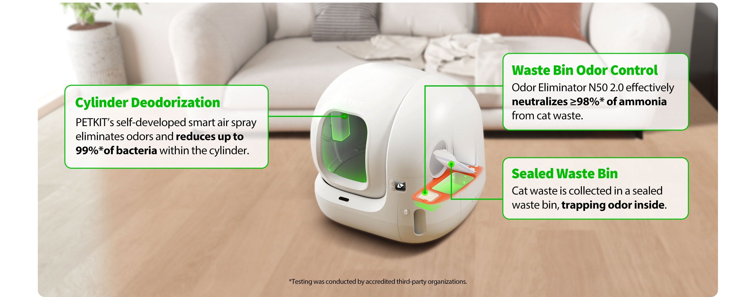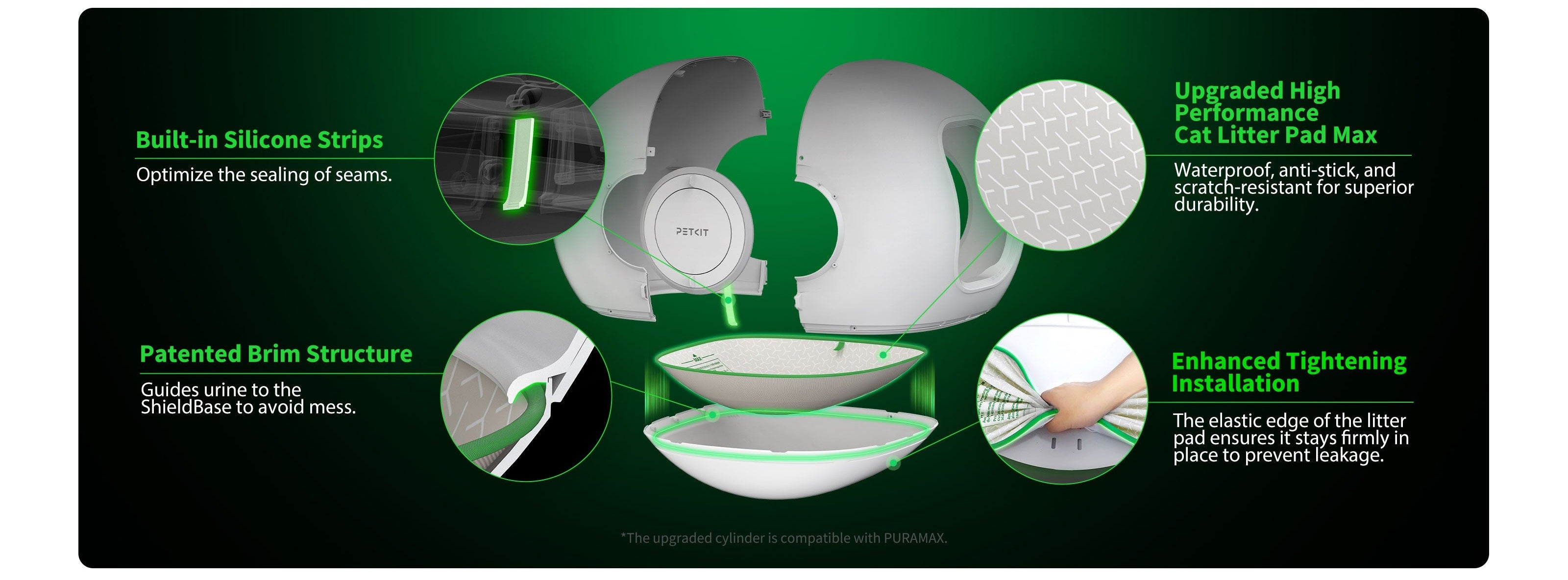 PURAMAX 2 rüstet den Zylinder mit einer nahtlosen Shield Base auf, um eine 360°-Dichtung zu gewährleisten und den Aufwand häufiger Reinigung zu reduzieren. Machen Sie sich keine Sorgen, wenn Ihre Katzen gerne an den Rändern oder in erhöhten Positionen urinieren.